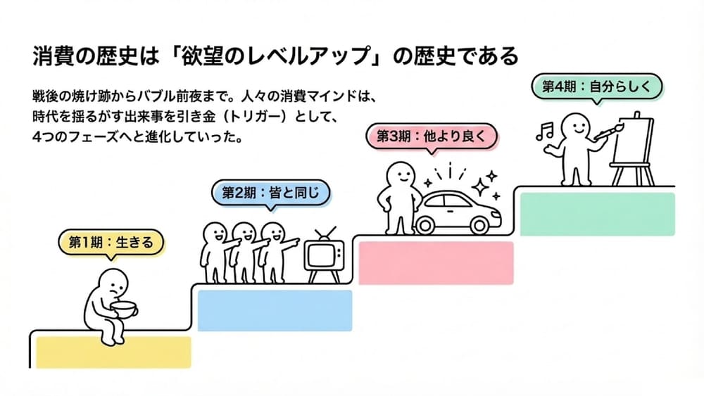 焼け跡を生き抜くための消費から始まり、「三種の神器」に象徴される大衆化、隣の誰かを意識する差別化、そしてセゾン文化に代表される自己実現のためのコト消費へ。